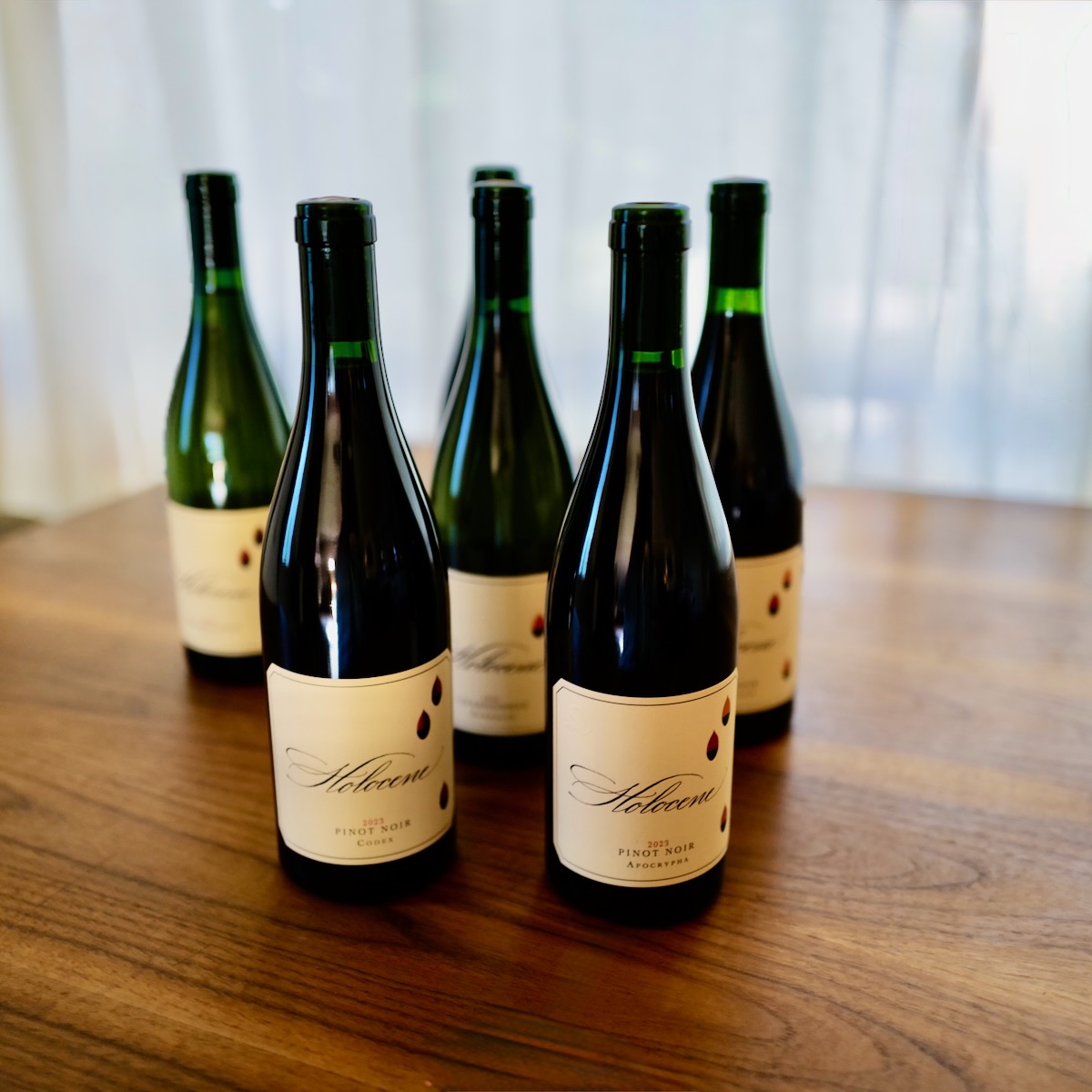 Two bottles each: 2024 Holocene Aureolin Chardonnay, 2024 Holocene Pyxis Chardonnay, 2023 Holocene Memorialis Pinot Noir, 2023 Holocene Sidereal Pinot Noir, 2023 Holocene Codex Pinot Noir, 2023 Holocene Apocrypha Pinot Noir
